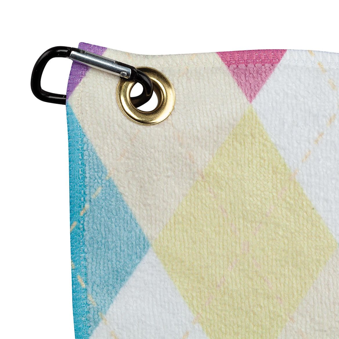 - Make a bold style statement on the course with this Personalized Bright Argyle Golf Towel! Personalize it for your favorite golfer—or treat yourself! Absorbent poly blend is perfect for wiping hands, golf balls or an icy beverage. Grommeted custom towel includes an aluminum carabiner clip to hang on your bag for easy access. Makes a great golf gift! Specify name/message: limit 1 line, up to 20 characters/spaces. 60% polyester/40% chinlon. Machine wash. Personalized towel measures 23 2/3" L x 15 3/4" W.