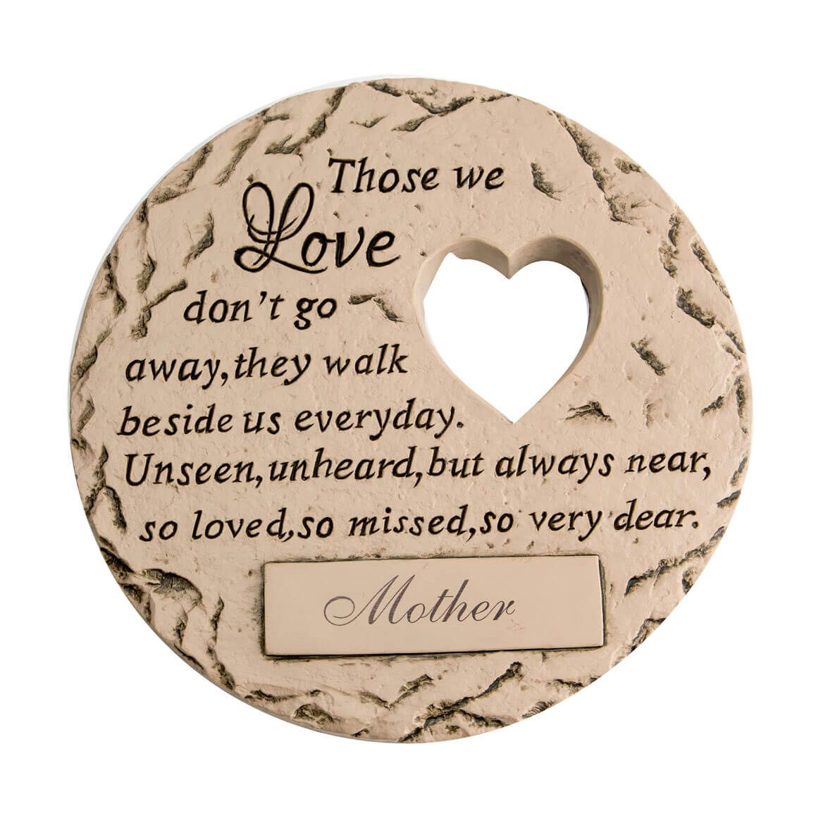 - This personalized "Those We Love" memorial stone lets you create a special place in your yard or garden to celebrate, remember ... and cherish the love that's always near. Crafted of durable, solid cement, the stone memorial is etched with these sentiments: "Those we Love don't go away, they walk beside us everyday. Unseen, unheard, but always near, so loved, so missed, so very dear". We'll add one special name, creating a comforting treasure for you or a grieving friend. Specify name; limit 1 line, 12 letters/spaces. Memory stone measures 10" dia. Store inside during cold or rainy weather.