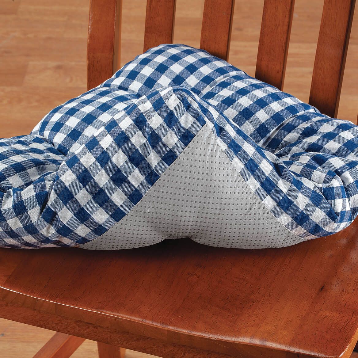 - Checked, cheerful and wonderfully comfy, this cushion lends a layer of plush coziness to any dining chair—updating your home's décor instantly! The plump, tufted chair pad provides soft, easy comfort, even on the hardest of chairs, making any seat at the table a place to sit back and relax. The classic gingham check pattern comes in four great colors, and this seat pad features slip-resistant gripper backing, so it stays securely in place without ties or fuss. This quality dining chair cushion is exclusively designed by OakRidge™ with 100% polyester exterior and plush polyester fill. 15" L x 15" W x 4" H. Spot clean. Imported.